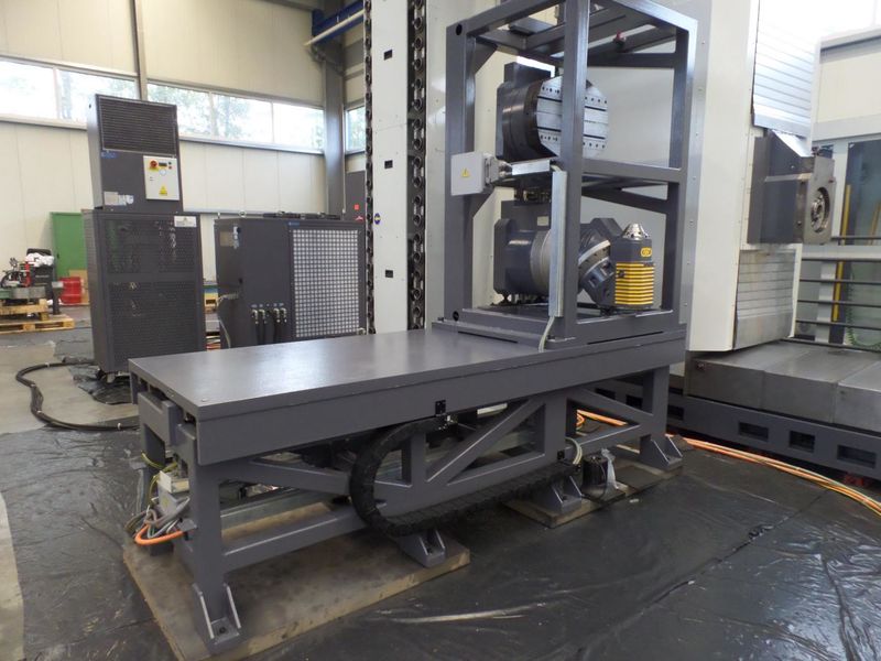 - ISO 50 BIG PLUS spindle mount with automatic tool clamping. The axis of the drilling spindle is 900 mm and the diameter is 150 mm. The surface is completely nitrided.