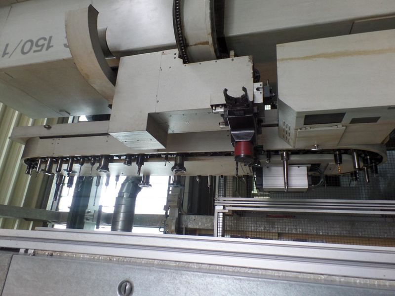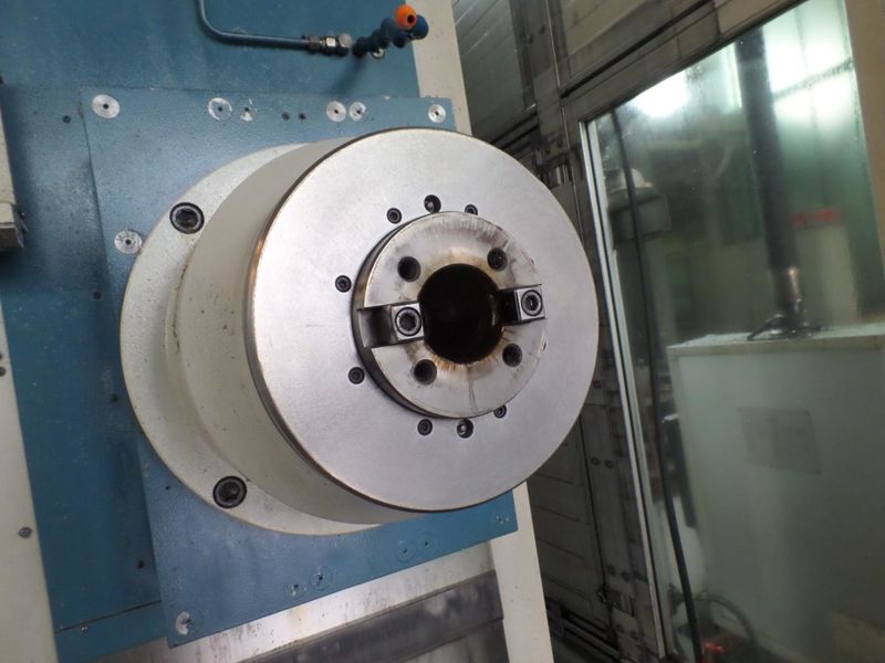 The UNION KC-150 is a 5-axis boring mill for the efficient complete machining of larger prismatic workpieces. The horizontal drilling and milling machine with movable column is equipped with a working spindle Ø 150mm and a tool magazine with 60 magazine places and automatic tool changing system. The work table with a clamping area of 2,000 x 2,500 mm can carry workpieces weighing up to 20 tons. The main spindle has a maximum torque of 2,179 Nm and can deliver up to 46kW at 3,000 rpm. A coolant system with paper band filter system, internal (20 bar) and external (3 bar) coolant supply as well as a special rotary housing, mounted on the table, complete the configuration of the UNION KC-150.